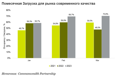 После весьма скромных результатов 2022 года, в течение которого рынок отелей современного качества увеличился всего на 340 номеров (Soluxe Hotel Moscow), в 2023 году ожидается открытие почти 900 новых номеров — в основном, в сетевых проектах различного ценового стандарта, чье открытие было перенесено с 2022 года на более поздние сроки ввиду необходимости замены бренда или полного отказа от него. В 1 квартале текущего года состоялось открытие первого отеля из семи ожидаемых — AZIMUT Moscow Comcity (150 номеров, ex.Novotel).